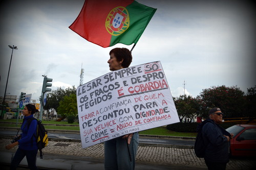 A minha tarde de sábado foi passada a fotografar a manifestação organizada pela CGTP em Lisboa. Das várias fotografias tiradas, destaco aqui a de uma cidadã que, erguendo a bandeira de Portugal, empunhava um cartaz com uma mensagem. Tirei várias fotografias a esta manifestante, não raras vezes cabisbaixa, quase sempre em silêncio e denotando, de forma clara, desânimo.