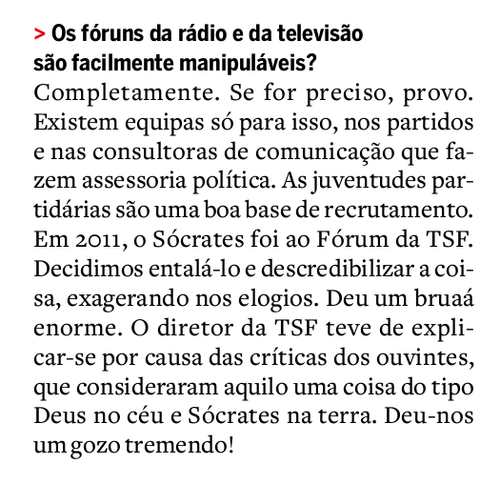 A propósito da entrevista de Fernando Moreira de Sá à Visão creio que a figura (me) merece poucos comentários. Já os métodos que refere são interessantes. Cínicos, é verdade. Mas seria demasiado ingénuo supor não haver cinismo na política.