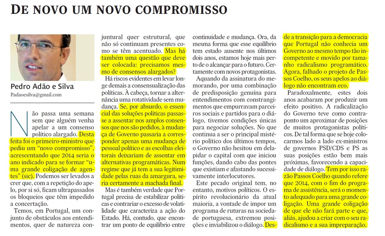 16Nov13 Pedro Adão e Silva - De novo um novo compromisso Nuno Oliveira Retirado do Expresso de hoje. Tweetar link do post comentar favorito