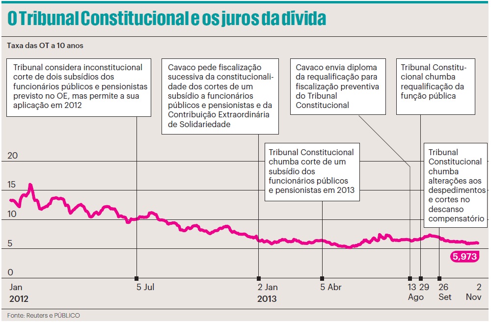 Curioso como, apesar dos tão propalados riscos constitucionais, a progressão dos juros da dívida no mercado secundário não evidencia nenhuma influência das decisões do Tribunal Constitucional.
