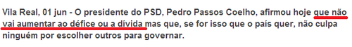 A este bonito programa eleitoral juntaram-se várias promessas de facilidades e prosperidade, proferidas ao longo da campanha por Pedro Passos Coelho. Bastava afastar Sócrates, davam a entender várias vozes do PSD (e do PP) na altura, e tudo se resolveria como num passe de magia. Não era preciso despedir, não haveria aumentos de impostos, não haveria cortes em subsídios. Nada disto era necessário e até eram classificados como "disparates" os avisos que alguns já estavam a fazer de que aquele delirante cenário não tinha nada a ver com aquilo que estava a ser preparado.