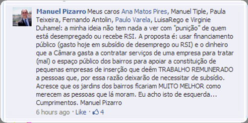 Folgo em ver que Manuel Pizarro está preocupado com a classificação das suas propostas políticas, mas deixo uma pergunta que não vi esclarecida: O dinheiro que o Estado gasta em RSI vem da Segurança Social. Como planeia Pizarro articular esse dinheiro 'central' com o dinheiro que a Câmara Municipal possa gastar (saberá qual é o montante em causa), i.e., de forma local? E como é que isso depende da esfera de acção de um Presidente da Câmara?