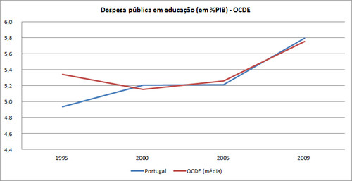 Antes de mais, convém realçar que o Eurostat não divulgou oficialmente dados referentes a 2010, relativamente ao nosso país. De seguida, segundo os parâmetros, quer do Eurostat, quer da OCDE (vd. “Education at a Glance 2012”), Portugal nunca teve um investimento público superior a 7% do PIB nem de 2 pontos percentuais acima dos seus parceiros europeus ou da OCDE. Por conseguinte, é, no mínimo, ridícula, a afirmação de que "investiu sempre muito acima da média europeia". Se tomarmos, como base comparativa uma estimativa de valores quanto aos anos de 2010, 2011, 2012 ou de 2013 ou o recém-difundido estudo do Conselho Nacional de Educação (vd. "Estado da Educação 2012"), o panorama comparativo agrava-se claramente, não obstante a ressalva de que houve uma clara aposta na educação entre 2005 e 2009.
