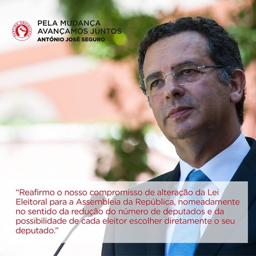 Com a divulgação do resultado das eleições europeias e do avanço de António Costa para a liderança do Partido Socialista, António José Seguro fez do seu cavalo de batalha a reforma da lei eleitoral, nomeadamente com as propostas de rever a lei das incompatibilidades dos deputados à Assembleia da República e de tratar da redução dos mesmos. Contudo, em Outubro de 2012, o mesmo António José Seguro prometeu que o PS apresentaria "até ao final do ano" uma "proposta de alteração da lei eleitoral para a Assembleia da República", que teria como objectivos o de alcançar uma “maior proximidade entre eleitos e eleitores e uma menor dependência dos eleitos face às direcções partidárias” e de “introduzir maior transparência na vida pública e aumentar a exigência na prestação de contas”. E essa proposta tinha claramente como ideal a redução dos representantes eleitos no parlamento português. Todavia, não me lembro e não encontrei qualquer registo de a bancada parlamentar do PS alguma vez ter apresentado tal projecto de "reforma" legislativa em 2012. Ora, como Seguro faz questão de repetir vezes sem conta que "Aquilo que prometo cumpro", só posso concluir que isto é falha minha.