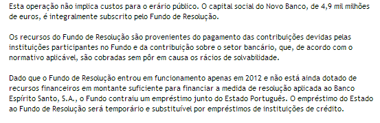 Primeiro, a mentira: que não é uma nacionalização, que nenhum dinheiro público irá ser gasto no BES. Claro que os 4 500 milhões (para começar) são um empréstimo da troika pelo qual estamos a pagar juros e claro que esse dinheiro, doravante emprestado ao fundo de resolução, nunca irá ser devolvido. E porquê? Quem não tiver memória curta e não papar a converseta dos comentadólogos televisivos lembra-se do exemplo do BPN, com um buraco que começou por ser de 800 milhões e já vai nos 6 000 milhões de euros.