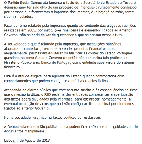 Tradução: a culpa disto tudo é do Sócrates por não ter atirado o senhor Secretário de Estado demissionário para as masmorras. Pois o senhor secretário de Estado do Tesouro, que não fez nada de criticável e é vitima duma campanha caluniosa caracterizada por uma ultrajante baixeza, é um criminoso. E o Sócrates não chamou a policia. Concluímos deste modo que o anterior governo pode estar por de trás deste escândalo nacional, no qual o nosso imaculado Secretário de Estado é o principal bandido. Aguardaremos.